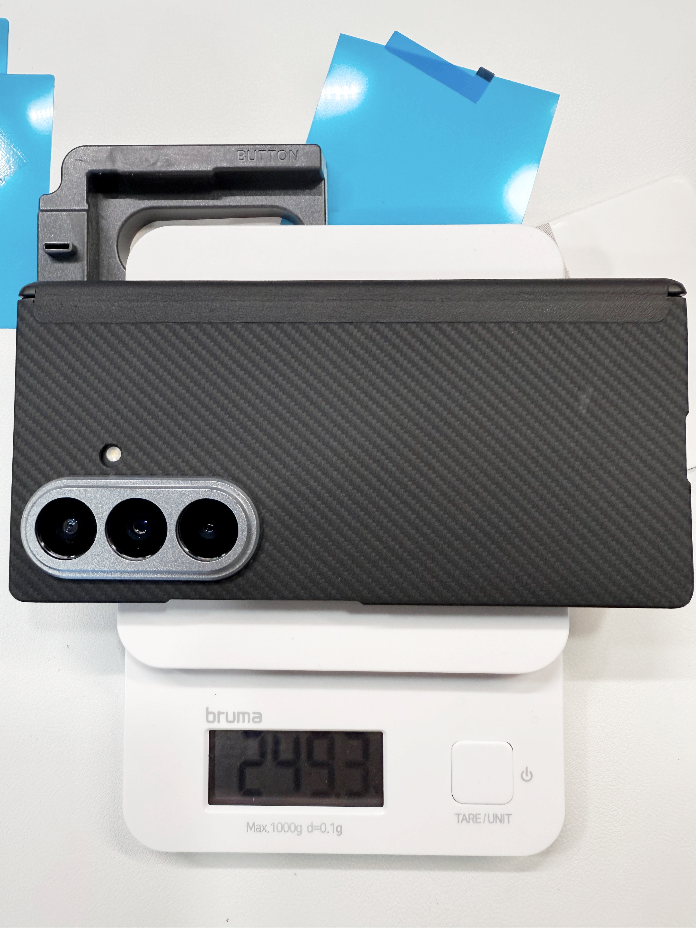 전면 케이스, 후면 케이스, 힌지 보호부 그리고 삼성 정품 AR 필름까지 모두 부착했음에도 불구하고 249g밖에 되지 않았습니다. 흥미로운 점은 기존 알리발 아라미드 케이스 역시 동일하게 249g이었는데, 이번 제품은 힌지 보호부와 힌지 자석까지 추가되었음에도 불구하고 실제 측정 시 0.6g 정도 더 가벼웠습니다. 이는 전면 케이스가 이전보다 조금 더 슬림하게 제작되었고, 사용된 소재 자체도 약간 더 가벼워진 영향으로 보였습니다. 결과적으로 폴드7 기본 무게 대비 약간 늘어난 수준에 불과하며, 다른 풀커버 케이스 조합 대비 최소 10~15g 이상 가볍습니다. 덕분에 실제 손에 쥐었을 때 ‘생폰에 가까운 느낌’을 유지할 수 있었습니다.