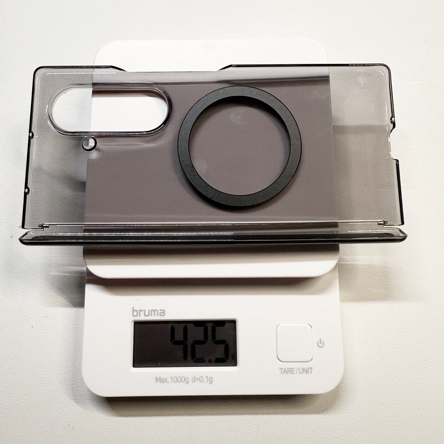다음으로 사용한 케이스는 하이온 힌지 슬림 맥세이프 하드 후면 케이스 블랙 다이아였습니다. 이건 5 세컨즈 카본 케이스와 방식이 완전 동일한 단지 블랙 투명 케이스입니다. 소재는 올 pc소재이며 이 케이스는 스펙상 무게가 41g으로 표기되어 있었지만, 직접 실측한 결과 42.6g이 나왔습니다. 약간의 오차가 있었지만, 이는 케이스 제조 공정이나 측정 환경에 따른 자연스러운 차이로 문제가 되지는 않았습니다. 실제 체감 무게도 크게 부담스럽지 않았습니다.